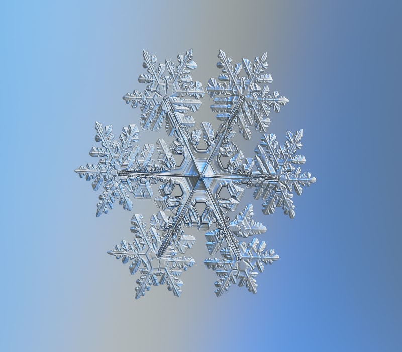 Immaginate di essere dei curiosi laboratoristi che conducono esperimenti di routine. Tra un esperimento e l’altro, quasi senza accorgervene, il cielo si incupisce e grandi fiocchi di neve iniziano a cadere leggeri, confondendosi con la vita quotidiana del centro di ricerca. Avete a disposizione un buon microscopio ottico da banco e quest’occasione non ve la potete davvero perdere. Decidete quindi di uscire dalla porta di servizio, in un baleno avete raccolto i due fiocchi da osservare con entusiasmo. Vi accorgerete subito che non solo non saranno uguali, quasi in ogni aspetto, ma possiedono vari livelli, gerarchicamente distribuiti, di aggregazione. Il vostro occhio velocemente cadrebbe probabilmente su delle piastre concentriche a pianta esagonale, prismi arroccati l’uno sull’altro sopra basamenti poligonali, forme dendritiche e geometrie frattali. Tali morfologie geometriche sono dovute alla randomica disposizione e orientamento delle gocce d’acqua una volta in caduta libera durante il processo di glaciazione.